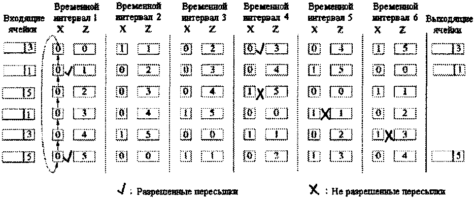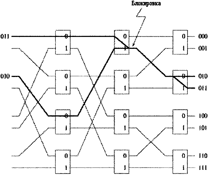 При этом возникновение внутренних конфликтов будет иметь место не только в случае, когда на переключатель поступают два пакета, которые должны быть направлены на один и тот же выход, но внутренние конфликты могут возникать и в случаях, когда пакеты не предназначены для одного и того же выходного порта.