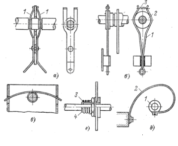 Рисунок 1.2 – Устройство токосъемов (а и б – пружинные токосъемы, в – пружинный упрощенный, г – цанговый токосъем, д – с гибким выводом).