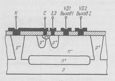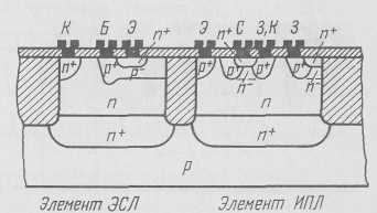 Рис. 10. Структура кристалла микросхемы, содержащей ЭСЛ и ИПЛ, изготовляемых в одном технологическом процессе с комбинированной изоляцией.