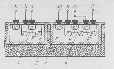 Рис. 4. Биполярно-полевая структура с изоляцией элементов р-п переходами и n-канальным полевым транзистором: /— диффузионная область базы биполярного транзистора; 2— область изолирующей диффузии; 3— р+-область верхнего затвора полевого транзистора; 4— область канала полевого транзистора