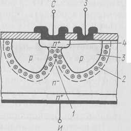 Рис. 7. Структура нормально закрытого полевого n-канального транзистора с управляющим р-п переходом: /— область канала; 2— область объемного заряда; 3— диффузионно-легированная кольцевая р- область затвора; 4— ионно-легированная п+- область стока.