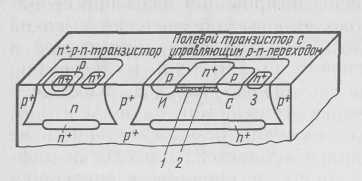 Обеспечить более точную регулировку концентрации легирующей примеси в канале, а следовательно и напряжения отсечки, по сравнению с диффузионной технологией, можно с помощью ионного легирования. Применение ионного легирования позволяет изготовлять микросхемы, содержащие на одном кристалле высококачественные биполярные транзисторы и высококачественные полевые транзисторы с точно согласованными параметрами. Структура, содержащая такие транзисторы, представлена на рис. 2. В ней одна ионно-легированная область образует канал р-типа между областями истока и стока, а вторая ионно-легированная область образует затворную область над этим каналом.