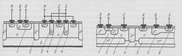 Рис. 5. Биполярно-полевая структура, содержащая ПТУП с вертикальным каналом n-типа: /—область канала ПТУП; 2—р+ -область затвора: 3— скрытый слой; 4— изолирующая р- область', 5—р+ -область пассивной базы; 6— р--область активной базы