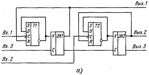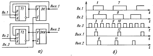 На рис.2, а показано устройство для временного разделения фронтов или срезов двух импульсных сигналов. Устройство содержит две схемы для синхронизации импульсов, одна из этих схем построена на триггере Т1 и 3K-I, а вторая — на триггере Т2 и ключе ЗКИ-1. На Вх. 1 и Вх. 2 подаются разделяемые во времени импульсные сигналы, на Вх. 3 — тактовые импульсы (рис. 2, б), на Вых. I и Вых. 2 формируются импульсы с разделенными во времени фронтами импульсов. В исходном состоянии Т1 и Т2 находятся в состоянии 0, на входах управления V ЗК и ЗКИ имеются сигналы 1. Тактовые импульсы, поступающие на вход коммутации ключа ЗК, коммутируются на его второй выход, не используемый в данном устройстве и не показанный на чертеже. Паузы между тактовыми импульсами коммутируются через ключ ЗКИ на второй не используемый в данном устройстве выход, на котором при этом формируются импульсы. На первых выходах ЗК и ЗКИ и на Вых. 1 и Вых. 2 устройства имеются сигналы 0. Одновременное поступление импульсов 1 и 2 (рис.2, б) на Вх. 1 и Вх. 2 приводит к переключению триггеров Т1 и Т2 в состояние I. Импульсы 1 и 2 поступили во время действия паузы между тактовыми импульсами, поэтому первый тактовый импульс 3, следующий после переключения триггеров Т1 и Т2, коммутируется на первый выход ключа ЗК и, следовательно, на Вых. 1 устройства (импульс 4), в результате чего триггер Т1 переключается в состояние 0. Пауза между тактовыми импульсами 3 и 5 коммутируется на первый выход ключа ЗКИ — на этом выходе и на Вых. 2 устройства формируется импульс 6, переключающий триггер Т2 в состояние 0. Устройство переходит в исходное состояние. Одновременное поступление импульсов 7 и 8 на Вх. 1 и Вх. 2 во время действия тактового импульса 9 приводит снова к переключению Т1 и Т2 в состояние 1. Пауза между тактовыми импульсами 9 и 10 коммутируется на первый выход ключа ЗКИ — на этом выходе и на Вых. 2 устройства формируется импульс 11, переключающий Т2 в состояние 0. Импульс 10 коммутируется на первый выход ключа ЗК и на Вых. 1 устройства (импульс 12), в результате чего Т1 переключается в состояние 0, а устройство переходит в исходное состояние. Таким образом, на выходе устройства формируются импульсы 4, 6 и 11, 12 с разделенными во времени фронтами.