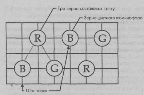 Это приводит к тому, что линии в изображении перестают казать ся сплошными, а цвета перестают быть чистыми. Шаг точек — это расстояние между двумя зернами люминофора одного цвета.