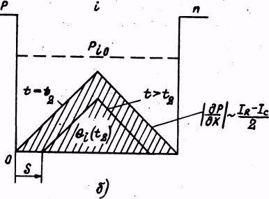 Фаза развития областей объемного заряда. При t >t>2> условие квазинейтральности в базе не может выполняться для всей i- области. У p-i- и i-n- переходов образуется области объемного заряда, которые разрастаются в направлении к середине i -области. При этом трапецеидальное распределение переходит в треугольное (рис. 4а) в момент
