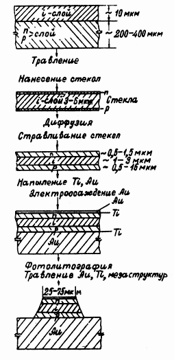 Технология полностью эпитаксиальных p-i-n- структур [12]. На низкоомной, ориентированной в плоскости (100) n-подложке выращиваются последовательно р- слой толщиной около 5 мкм с >p> 0,001 Ом*см, нелегированный i- слой (от 1 до 15 мкм) и тонкий (~1 мкм) n- слой >n> 0,0015 Ом*см. Такая структура эпитаксиальных слоев позволяет, используя селективный травите ль, полностью стравить n- подложку и получить однородные по толщине обращенные мезаструктуры с низким удельным сопротивлением p- и n-областей (рис. 5,г).