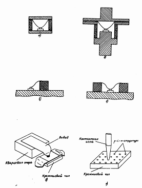 а) в кварцевый корпус, б) в металлокерамический корпус, в,г) на штифтах с одной и двумя металлизированными опорами, д) прямая мезаструктура с балочными выводами, е) "сотовая" структура.