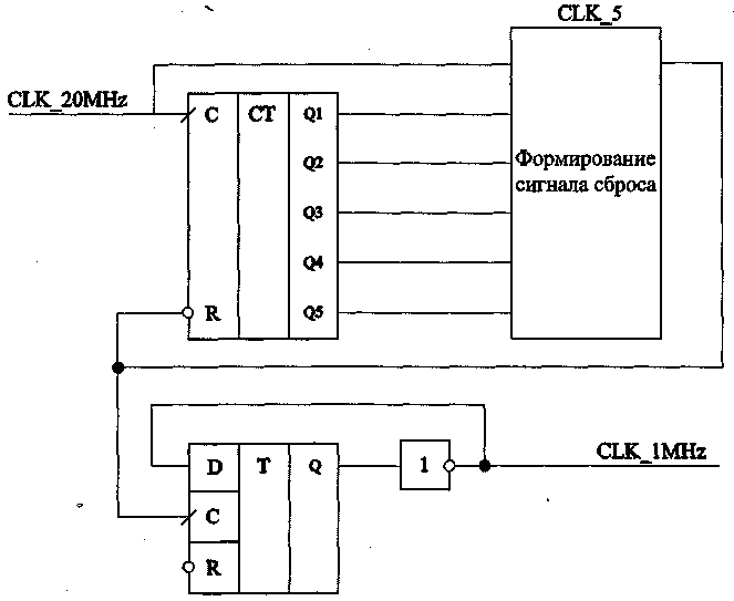 На рисунке 5 представлена схема деления частоты на 20. Входной сигнал частотой 20 MHz поступает на синхронизирующий вход пяти разрядного счетчика. Блок CLK 5 осуществляет формирование строба через каждые 10 импульсов синхронизации с длительностью равной 50 нc (20 MHz) Выходные стробирующие импульсы поступают на синхронизирующий вход триггера, результатом работы которого является меандр частотой 1 MHz, смотри рисунок 6.