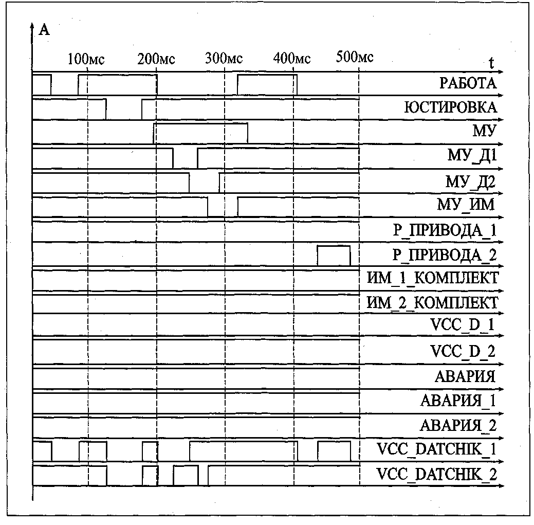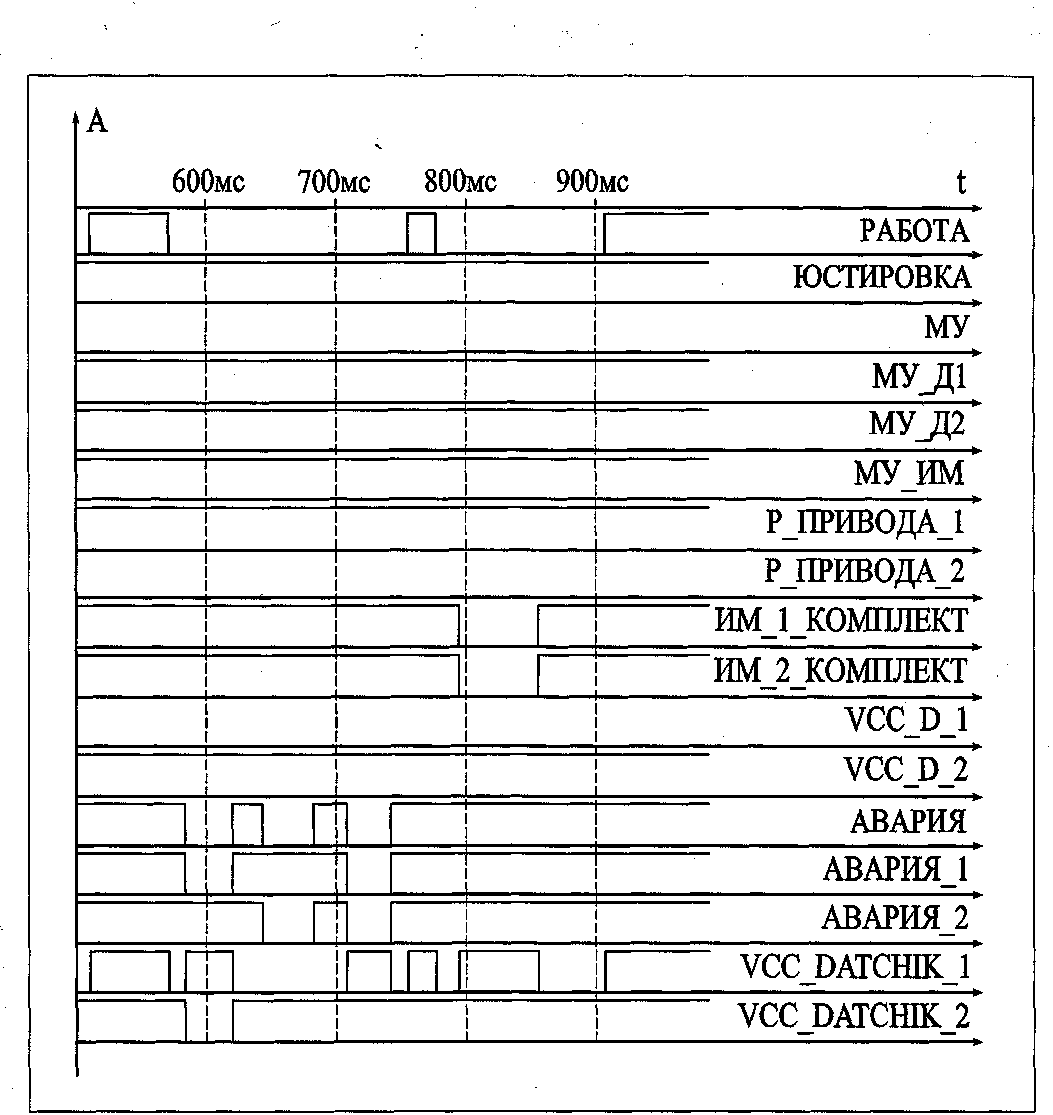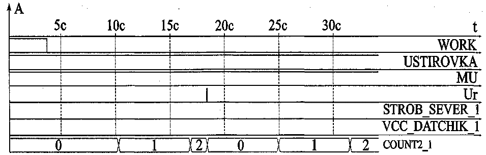 При включении режима WORK осуществляется нормальная работа схемы и контроль входных сигналов. В режиме USTIROVKA или MU - контроль сигналов не функционирует и режим формирования сигналов УХУДШЕНИЕ и АВАРИЯ не происходит. Помимо этого в режиме USTIROVKA схема автоматически устанавливает сигнал VCC _DATCHIK 1 в положение, соответствующее работе первого оптического датчика.
