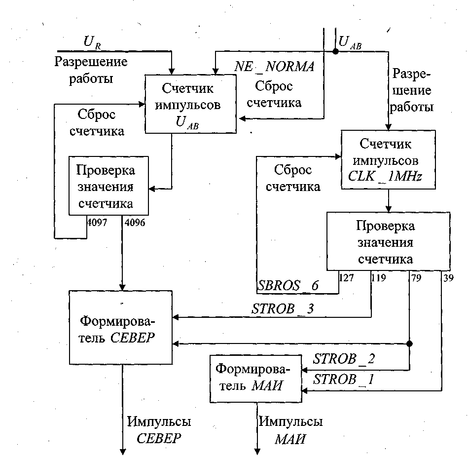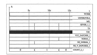 Так как схема управляется внешними сигналами, и неожиданное переключение может вызвать незапланированное неправильное формирование сигнала ошибки, проверка числа импульсов U>АВ> осуществляется во время прихода второго импульса U>R>, в результате чего происходит формирование строба NORMA _ 1, если число импульсов соответствует 4096-и, NE _ NORMA _ 1, если число импульсов U >АВ> лежит в допустимых пределах и NE_V_ DOPUSKE_1, если их число выходит за значения, указанные в разделе констант, смотри рисунок 13. При работе схемы под воздействием управляющих сигналов ЮСТИРОВКА, MU_D1 или MU_D2, последние два действительны только при наличии дополнительного сигнала, включающего режим местного управления, схема контроля входных сигналов модуля MAI _1 прекращает свою работу и устройство не реагирует на возникновение каких-либо нарушений в работе оптических датчиков.
