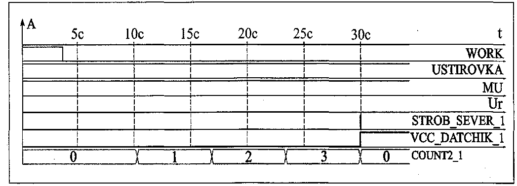 Формирование необходимой паузы в 30 с организуем с помощью двух 16-и разрядных счетчиков COUNT _ 1 _ 1 и COUNT _ 2_ 1 на синхронизирующие входы которых подадим синхроимпульсы частотой 1 МГц для первого и старший разряд первого счетчика - для второго соответственно. Таким образом, для формирование необходимой паузы, второй счетчик должен досчитать до числа 458, при возникновении которого с помощью D триггера D2 _1 формируется строб STROB _SEVER _ 1, по которому осуществляется формирование сигнала VCC _ DATCHIK _ 1, управляющего работой оптического датчика смотри рисунок 9 (Здесь, для наглядности, показан один счетчик, и частота синхронизации увеличена в 100 раз). При появлении сигнала U>R>, счетчики сбрасываются, и цикл ожидания повторяется заново смотри рисунок 10. Помимо вышесказанного, сигнал управления питанием датчика - VCC _DATCHIK _1 формируется не в любое время (по возникновению STROB _ SEVER _1), а во избежания формирования искаженного импульса, только после окончания действия сигналов U>AB> и U>R>, благодаря JK триггеру D1_1, сброс которого осуществляется сигналом управления WORK смотри рисунок 11. Кроме того, функционирование модуля SEVER _1 осуществляется под воздействием внешних сигналов управления: