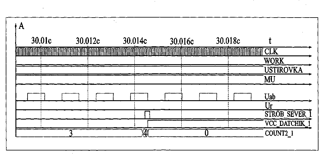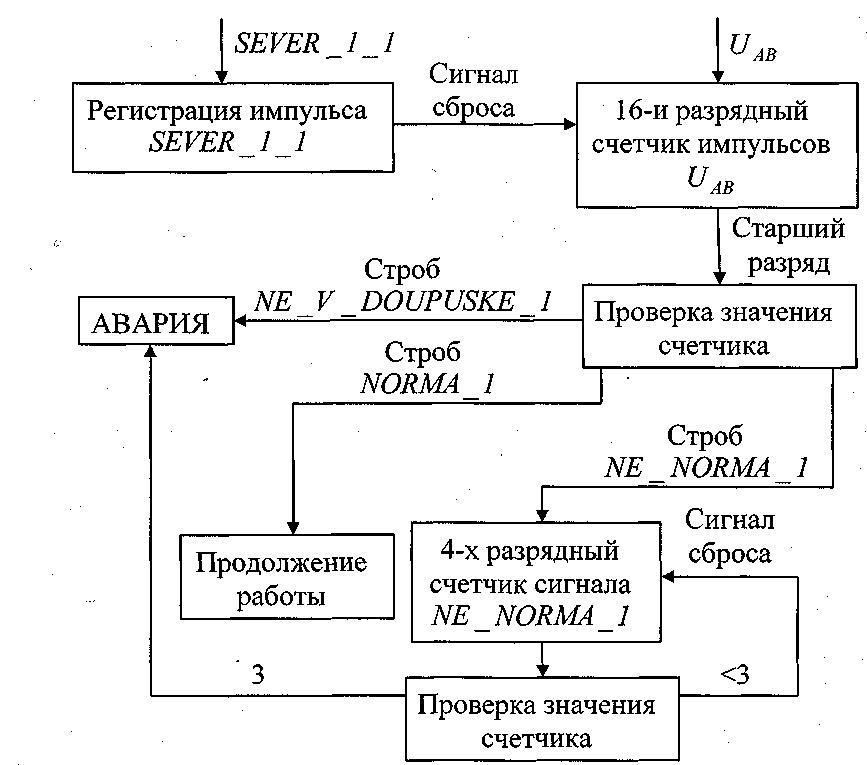 В паспорте на оптический датчик (ЛИР-158А) сказано о возможности изменения числа импульсов 4096 в переделах ±15 импульсов, то по возникновению данной ситуации будем формировать строб отклонения числа импульсов от заданного. При сильных изменениях в числе импульсов U>Ав> будем формировать сигнал АВАРИЯ, и устанавливать сигнал VCC DATCHIK 1, управляющий работой первого датчика, в положение выключено.