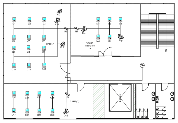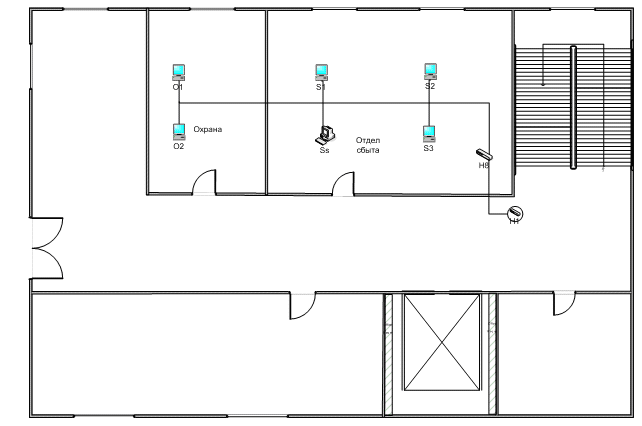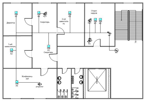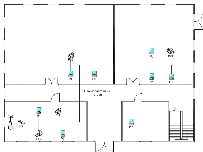 План помещений и размещения оборудования сети (второй корпус - производственный отдел)