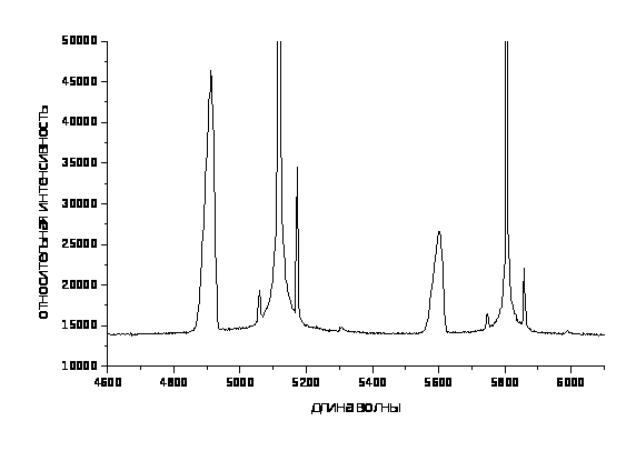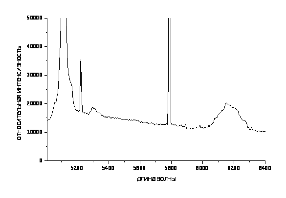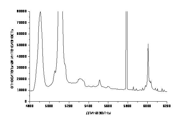 Во-вторых, в спектре излучения медного лазера присутствуют разрядные линии. Их хорошо видно на рисунке 1, который был снят в отсутствие кюветы с жидкостью. Эти линии, при использовании лазера в других целях (например, в медицине), не создают помех в работе вследствие своей относительно малой интенсивности. При наблюдении же спектров комбинационного рассеяния интенсивность этих линий оказывается больше интенсивности сигнала КР. Так же они закрывают собой значительную часть спектральной картины и, в частности, места возможного обнаружения линий КР.