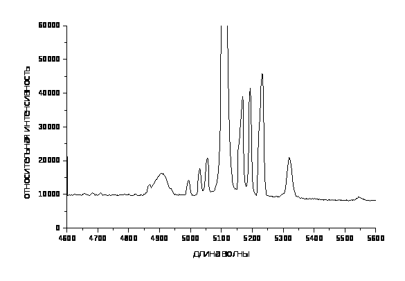 Рисунок 1. Спектр излучения лазера на парах меди в спектральном интервале, интересном для изучения КР.