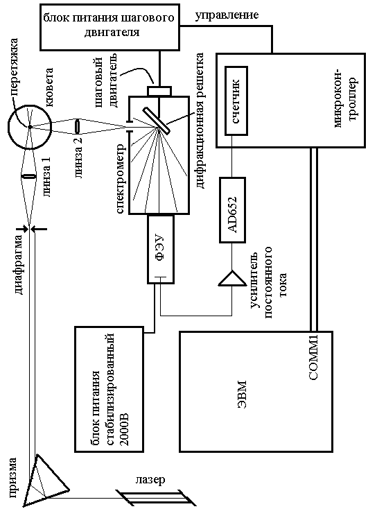 Разработан и собран автоматизированный КРС – спектрометр для наблюдения комбинационного рассеяния в жидкостях с двухуровневым управлением (компьютер – микроконтроллер).