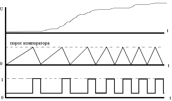 В зависимости от выходного сигнала компаратора импульсы тока фиксированной длительности (т. е. с фиксированным приростом заряда) подключаются при каждом изменении тактовых импульсов либо к суммирующему входу, либо к земле, что позволяет поддерживать нулевой средний ток на суммирующем входе. Это принцип уравновешивания [4] (Его особенность заключена в применении конденсатора для отслеживания отношения уровня входного сигнала к эталонному: рис. 2). Счетчик отслеживает число импульсов подключения к суммирующему входу (не более 2млн). Полученное число будет пропорционально среднему входному уровню за это число тактовых импульсов. После того, как сигнал выхода интегратора достигает порога компаратора, выход вентиля AND переходит в верхнее состояние. Ничего не происходит, пока нулевой уровень тактового генератора не попадает на вход триггера. В этот момент, тактовый генератор находится в состоянии нижнего уровня, поэтому триггер не меняет состояние. Когда генератор возвращается в единичное состояние, триггер также переходит в единичное состояние (рис. 4) и дает команду переключателю вычесть из интегратора определенное наперед заданное значение; в этот самый момент, триггер дает команду вентилю AND встать в нижнее состояние выхода. На следующем отрицательном такте генератора, нижнее выходное состояние вентиля AND передается на вход D триггера. Когда генератор возвращается в верхнее состояние, выход триггера переходит в нижнее состояние и дает команду переключателю вернуться в режим интегрирования. В то же самое время триггер дает команду на вход вентилю AND встать в режим высокого уровня.