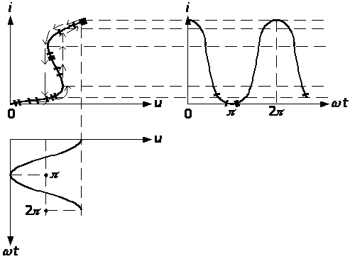 На рисунке 8.20 показан случай, когда к параллельному контуру подключен элемент с характеристикой типа S. Здесь изменяется напряжение по гармоническому закону и не удается использовать падающий участок. Характерным является то, что ток изменяется в фазе с изменением напряжения, в то время как при работе на падающем участке ток должен изменяться в противофазе с изменением напряжения.