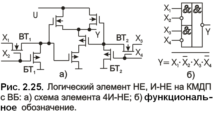 На рис. 5 приведена схема ЛЭ, выполняющего функцию 4И-НЕ, причем два входа этой схемы являются инверсными, что обеспечивается за счет подключения двух схем НЕ, И на КМДП с ВБ к традиционной двухвходовой схеме И-HE.