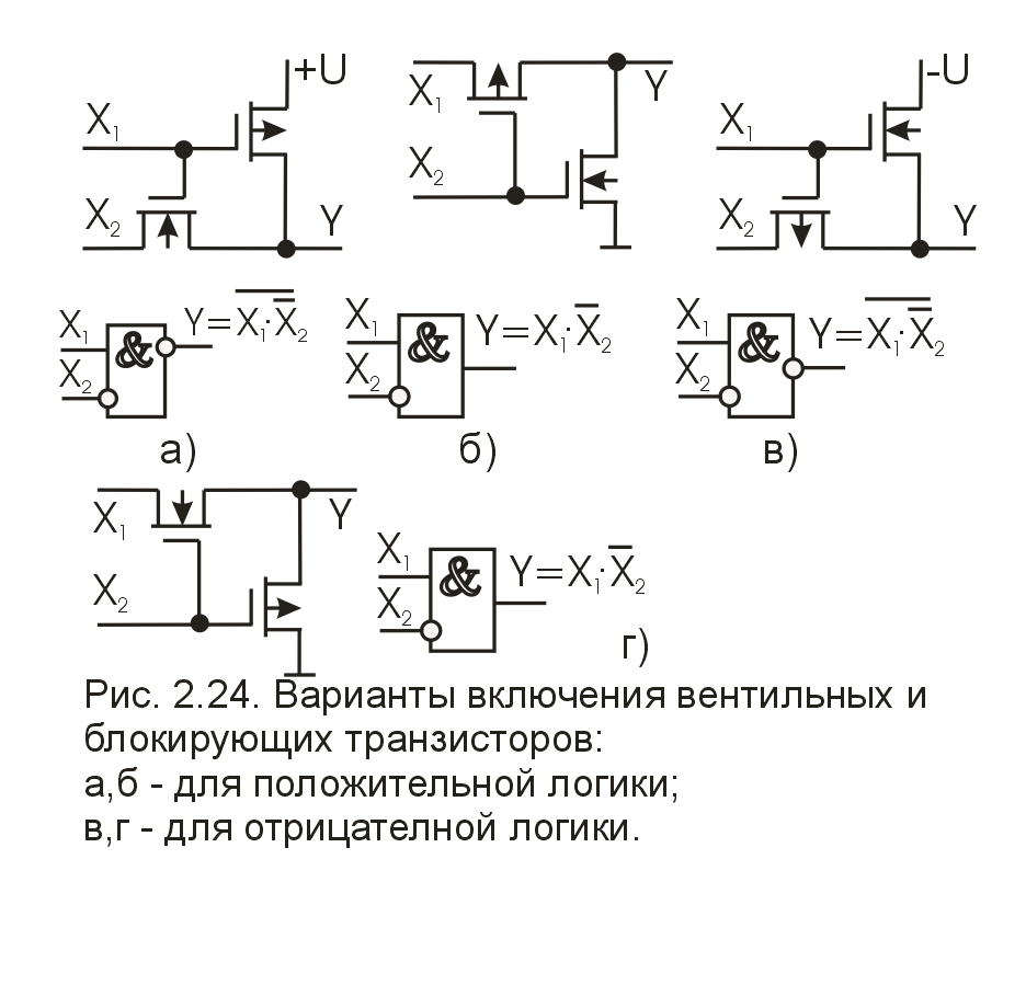 ЛЭ этой разновидности построены с учетом положительных вентильных свойств МДП-транзисторов. В каждом двуxвxoдoвoм ЛЭ с вентильным и блокирующим КМДП-транзисторами (КМДП с ВБ) имеется один собственно вентилирующий МДП-транзистор n-типа (или р-типа) и связанный с ним по затвору второй, блокирующий МДП-транзистор р-типа (n-типа). Объединенные затворы вентильного и блокирующего транзисторов (ВТ и БТ) во всех случаях являются одним из логических входов ЛЭ, сток ВТ — вторым логическим входом, а объединенные истоки ВТ и БТ — выходом ЛЭ. Роль ВТ может выполнять транзистор n- или р-типа, а БТ может быть подключен своим стоком либо к источнику питания, либо к общему проводу. Во всех вариантах включения ВТ и БТ выполняется функция И с запретом (НЕ, И) с инверсией или без инверсии по выходу.