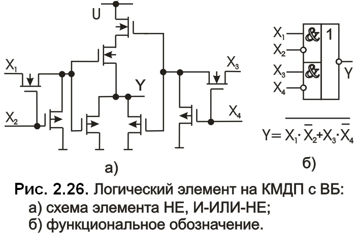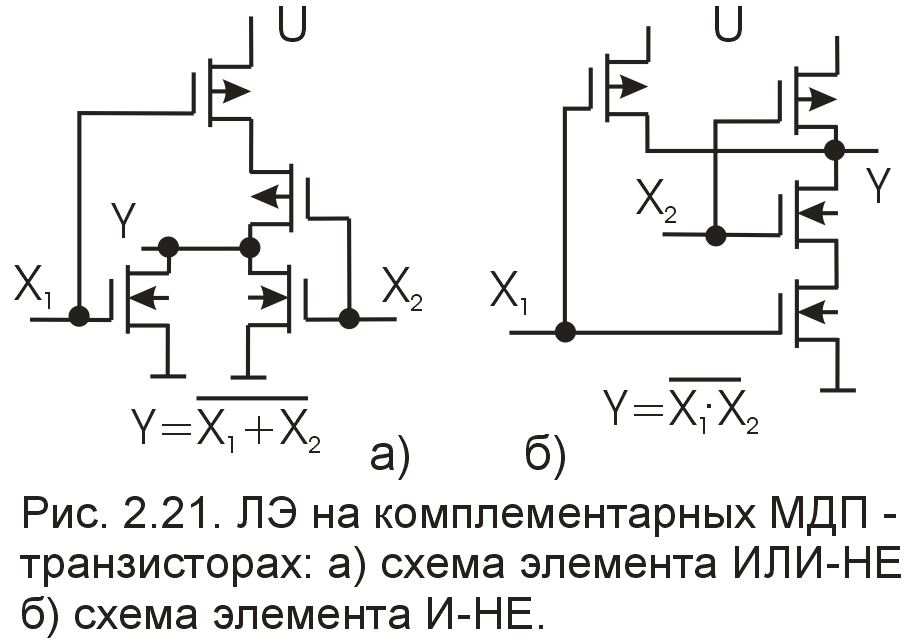 На основе КМДП могут быть построены элементы ИЛИ-НЕ положительной логики при параллельном включении транзисторов n-типа и последовательном включении транзисторов р-типа и элементы ИЛИ-НЕ отрицательной логики при параллельном включении транзисторов р-типа и последовательном включении транзисторов n-типа.