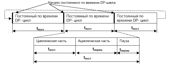 В некоторых случаях необходимо, чтобы шинный цикл DP по времени оставался постоянным (рис.3) и, следовательно, обмен данными должен происходить строго периодически. Это находит применение, например, в технике электроприводов для самосинхронизации нескольких приводов. В отличие от нормального DP цикла при постоянном по времени цикле в DP-Master резервируется определенная часть времени для ациклической передачи данных. Постоянный по времени DP-цикл может быть установлен только в системе с одним мастером.