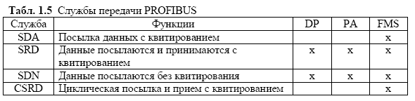 Службы с различными алгоритмами обмена данными (табл.2) вызываются через точки доступа к службе SAP (Service Access Point) из вышестоящего уровня. В PROFIBUS-FMS используются эти точки доступа для адресации логических коммуникационных связей. В PROFIBUS-DP и PA применяемые точки доступа строго упорядочены. У всех активных и пассивных участников можно использовать параллельно несколько точек доступа. Различаются точки доступа источника SSAP (Source Service Access Point) и точки доступа цели DSAP (Destination Service Access Point).