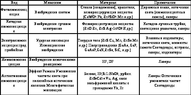 Явление, при котором вещество, либо поглощая энергию света ионизирующего или другого излучения, либо под действием различных химических реакций переходит в возбужденное состояние, а затем, возвращаясь в исходное состояние, излучает полученную энергию в виде света, называют люминесценцией. Кратковременное люминесцентное излучение, прекращающееся почти сразу с окончанием возбуждения, это флюоресценция, а длительное, продолжающееся и после окончания возбуждения, - фосфоресценция. Явления люминесценции делятся на несколько видов, в зависимости от способа возбуждения (табл. 1).