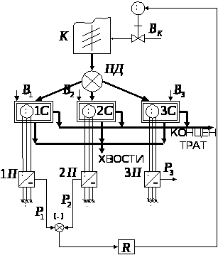 Рис. 9. Функціональна схема системи автоматичної оптимізації, де: К - класифікатор; ПД - пульподільник; 1С, 2С, 3С - магнітні сепаратори; 1П, 2П, 3П - перетворювачі активної потужності; R - регулятор; B>1>, B>2>, B>3> - витрати додаткової води в сепаратори; В>к> - витрата додаткової води в класифікатор; Р>1>, Р>2>, Р>3> - сигнали активної потужності приводних двигунів сепараторів.