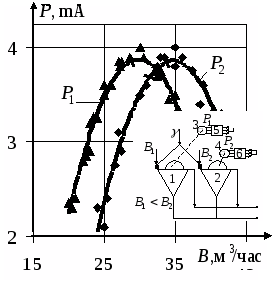 Рис.1. Експериментальні статичні характеристики двох паралельно працюючих магнітних сепараторів, де: 1, 2 - магнітні сепаратори; 3, 4 - електродвигуни; 5, 6 - вимірювальні перетворювачі активної потужності; P>1>, P>2> - вихідні токові сигнали вимірювальних перетворювачів активної потужності; B - витрата води; g - густина зливу класифікатора.