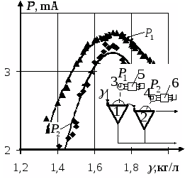 Рис.2. Експериментальні статичні характеристики комплексу магнітної сепарації з перечищенням промпродукту, де: 1, 2 - магнітні сепаратори; 3, 4 - електродвигуни; 5, 6 - вимірювальні перетворювачі активної потужності; P>1>, P>2> - вихідні токові сигнали вимірювальних перетворювачів активної потужності; B - витрата води; g - густина зливу класифікатора.
