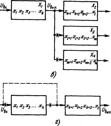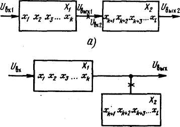 Если неисправный телевизор (блок, модуль, каскад) после исключения вспомогательных элементов заработал, то значит, дефектный элемент х'>i>, находится в области вспомогательных элементов X'; если не заработал — дефект среди основных элементов. Таким образом, рассматриваемый метод состоит в том, чтобы из неисправного телевизора изъять на некоторое время вспомогательные элементы и проанализировать после этого работу телевизора (блока, модуля, каскада) (рис. 6).