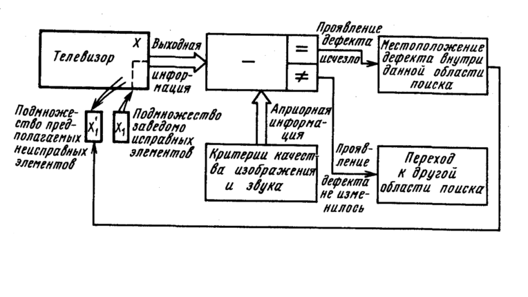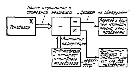 Все изменения монтажа можно рассматривать как поток информации от телевизора к органам чувств радиомеханика; этот поток информации сравнивается с представлением о монтаже исправного телевизора (рис. 1). На основе сравнения (—) вырабатывается суждение о соответствии ( = ) или несоответствии (≠) монтажа норме и в зависимости от этого выбирается дальнейший путь поиска неисправности.