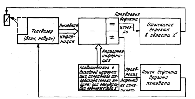 Метод измерений применяется в том случае, когда уже существует заключение о возможных причинах дефекта — определена область нахождения X'. Работа каждого элемента в телевизоре может быть оценена определенными электрическими характеристиками.