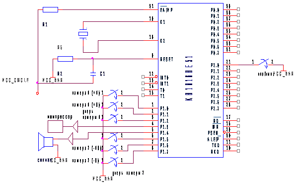 Схема контроллера представлена в приложении 3, RC цепь требуется для формирования сигнала сброса при включении питания и кварцевый резонатор 12 МГц. Так как для хранения прикладной программы используется РПП, то на вход отключения РПП (ЕА) подается уровень логической «1».