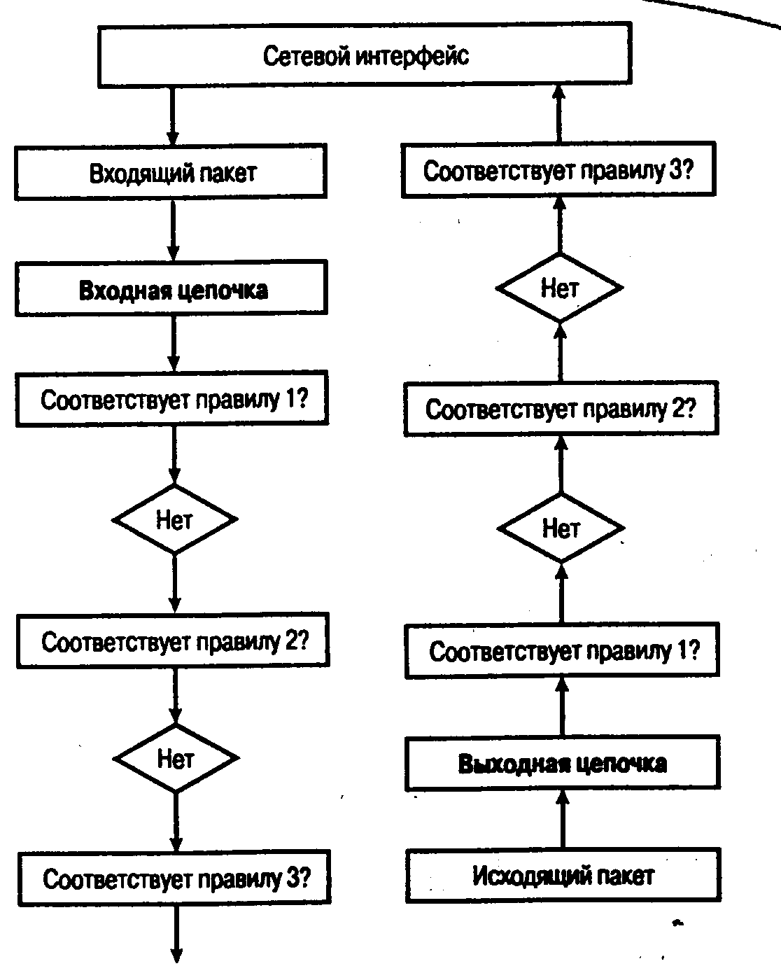 При настроюванні комп’ютера правила для конкретного мережного інтерфейсу зручно представляти як пари введення / виведення. Тому що вхідні і вихідні пакети обробляються незалежно один від одного, процеси фільтрації вхідних і даних керуються різними наборами правил. Списки правил, що керують фільтрацією пакетів, що надходять ззовні в локальну мережу і відправляються з локальної мережі в Internet, прийнято називати ланцюжками. Термін ланцюжок використовується тому, що при перевірці пакета правила застосовуються послідовно одне за одним, поки список правил не буде вичерпаний. Таким чином, пари введення / виведення — це вхідна (input) і вихідна (output) ланка, одна з них виявляє собою набір правил для вхідних, а інша - для вихідних даних.