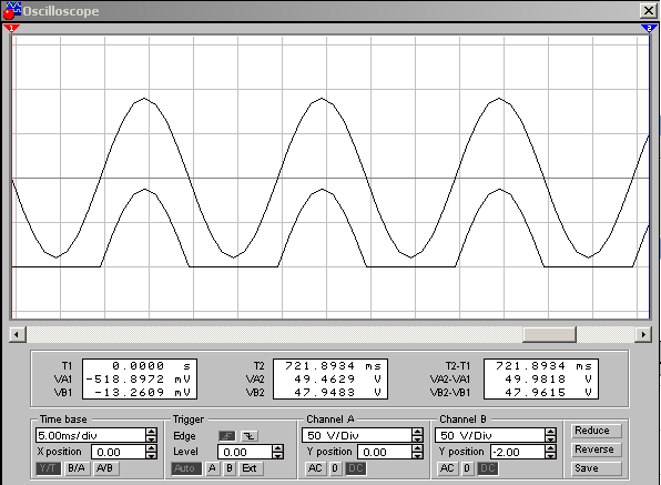 Отже, як видно з показів осцилографа вхід, на який ми подаємо сигнал відсікає від’ємну складову.