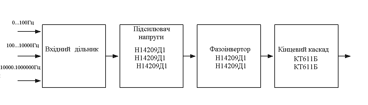 Кінцевий каскад – забезпечує підсилення потужності сигналу для ефективним управлінням навантаженням. Так як він вносить в сигнал мінімальні спотворення, то коефіцієнт підсилення цього каскаду вибирають невеликим, у деяких випадках, наближено, рівним одиниці.