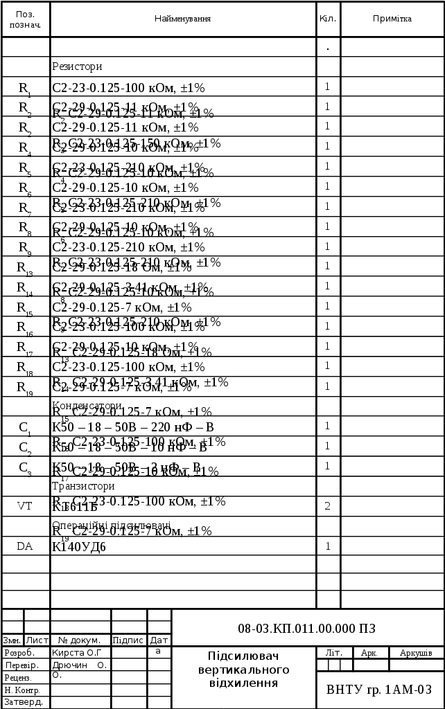 В „Електричних розрахунках” були розраховані номінали елементів кінцевого каскаду, вхідного дільника та підсилювача напруги.