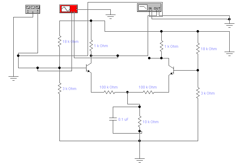 До підсилювача потужності підключено генератор, осцилограф та плотер. На рис. наведено вигляд схеми у вікні програми Electronics Workbench 5.12.