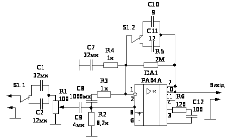Отже, остаточна електрична схема першого каскаду з регулятором підсилення та перемикачем діапазонів буде мати такий вигляд, як показано на рисунку 7. Перемикач S1 здійснює перемикання робочих частотних діапазонів підсилювача. В положенні S1.1а і S1.2а – підсилювач працює в діапазоні частот 50 Гц – 6,4кГц, в положенні S1.1б і S1.2б – підсилювач працює в діапазоні частот 150 Гц – 4,5кГц. Схема електрична принципова розрахованого підсилювача зображена на рисунку 2.1.