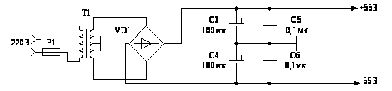 В якості містка використовуються будь-які чотири однакових діода, з максимальним струмом 5 А. Слід також врахувати захист від короткого замикання і слід поставити запобіжник ПМ0,5 в коло первинної обмотки трансформатора Т1 ТПП271-127/220-50. Після діодного моста VD1 та VD2 КЦ410Б ставляться конденсатори С4-С7: К52-3-100 В-100 мкФ та С9-С12: К77-2-100 В-0,1 мкФ. Схема електрична принципова джерела живлення показана на рисунку 2.2.