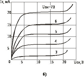 Рисунок 5.3 – Вольт-амперные характеристики полевого транзистора с р-п- переходом и каналом п- типа: а – стоковые (выходные); б – стоко - затворная