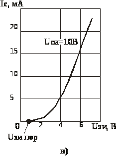 Стоковые (выходные) характеристики Ic=f(Uси) и стоко-затворная характеристика Ic = f(Uзи) полевого транзистора с индуцированным каналом n-типа приведены на рис. 5.5, б; в.