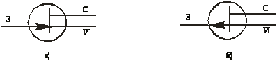 Рисунок 5.2 – Условное обозначение полевого транзистора с р-n-переходом и каналом n- типа (а), каналом р- типа (б)