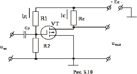 В усилителях на МДП - транзисторах с индуцированным каналом необходимое напряжение Uзип обеспечивается включением в цепь затвора делителя R1R2 (рис. 5.10).