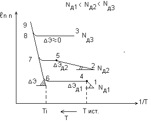 а) N>Д1> – малая концентрация доноров. В области низких температур увеличение концентрации электронов при нагревании полупроводника обусловлено возрастанием степени ионизации доноров (участок 1–4). Каждый ионизированный донор можно рассматривать как центр, захвативший дырку, наклон прямой на участке 1–4 характеризует энергию ионизации примесей.
