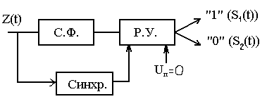 Регистрация в решающем устройстве происходит в момент времени t=T. Рассмотрим структурные схемы для приема сообщений синхронным и асинхронным способами принятия решения в решающей схеме по выходному сигналу СФ.
