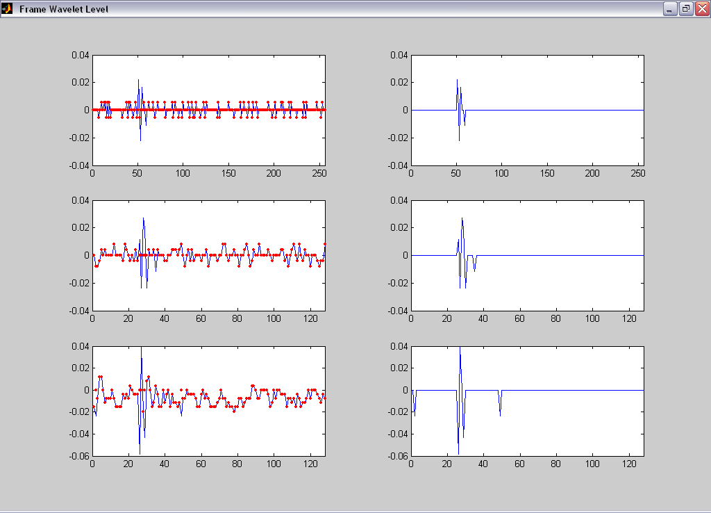 На рис. 6 слева представлены графики двух уровней вейвлет-разложения речевого сигнала (первого и второго детализирующего уровня и второго аппроксимационного уровня), а справа – графики вейлет-коэффициентов после пороговой обработки.
